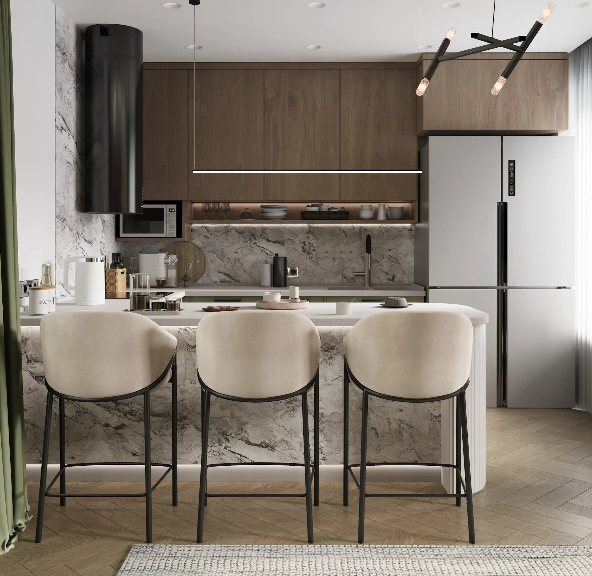 Особую атмосферу задают балки и стеновые панели, выполненные из шпона дуба, которые не только подчеркивают элегантность интерьера, но и добавляют ему тепла и уюта.