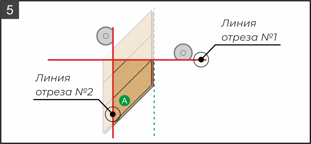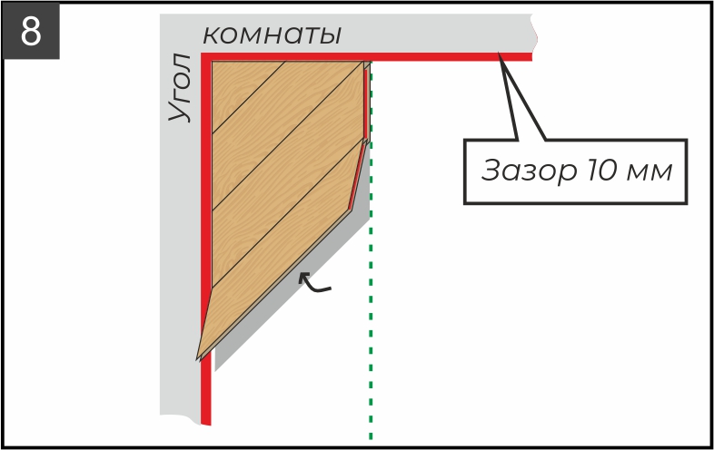 9.2. Отрежьте край ряда по указанной на рисунке красной линии (она формируется в зависимости от левого угла комнаты). Исходя из расчетов (см. рисунок 5) при необходимости подрежьте плашки по длине. В зависимости от типа пилы, которую вы используете, разберите плашки и отпилите каждую по отдельности или сделайте это уже в сборке, предварительно наметив линию при помощи угольника и карандаша.